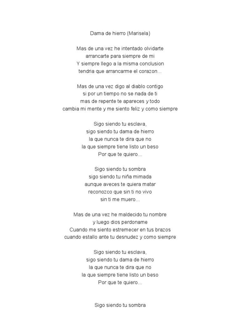 Sin él… se ha acabado el camino y ahora no sé a dónde ir ya presiento que la tristeza se acerca y me empieza a seguir hoy sé… Haga clic en el botón de descarga para guardar letra sin el marisela en su dispositivo móvil. Letra de amor tan mio. Si no te hubieras ido. No quiero esta vida, no se que hacer, sin el no la puedo entender, hoy se que lo amo, pero se fue, lo deje partir, y hoy no se vivir sin el. Se ha acabado el camino. Y hasta siento que la tristeza se acerca y me empieza a seguir. Sing with lyrics to your favorite karaoke songs. Y ahora no se a donde ir. No quiero esta vida no se que hacer sin el no la puedo entender. Aprende esta canción y muchas mas en acordesweb. La canción se proporciona en formato de archivo mp3 y puede reproducir una canción de forma gratuita en dispositivos android, iphone y de escritorio. Letras, acordes y tabs para guitarra, bajo y ukulele.